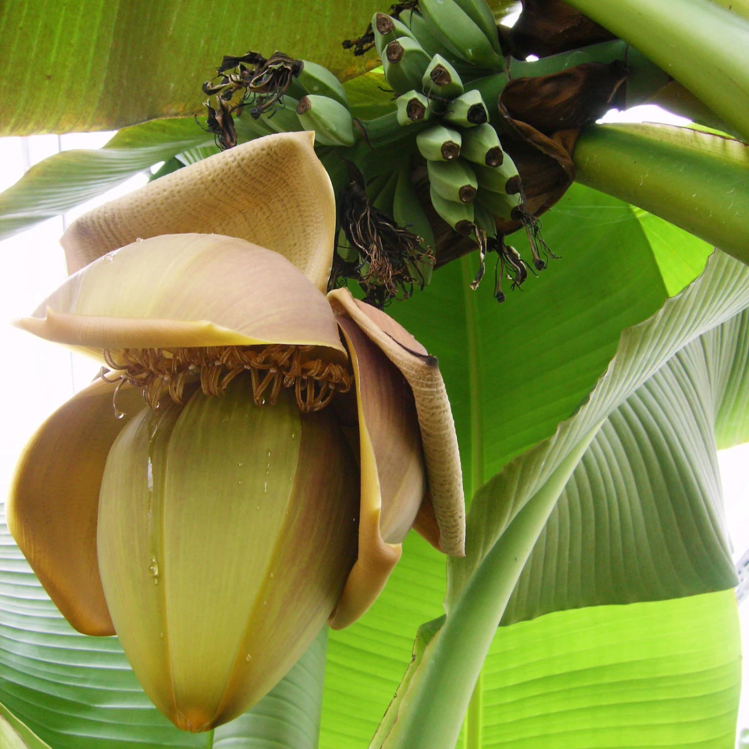 Die großen Blüten der Bananenpflanze erscheinen frühestens im 2. Jahr und sind von violetten Hüllblättern umgeben Die Blüten verströmen einen leichten Honigduft in Ihrem Garten.